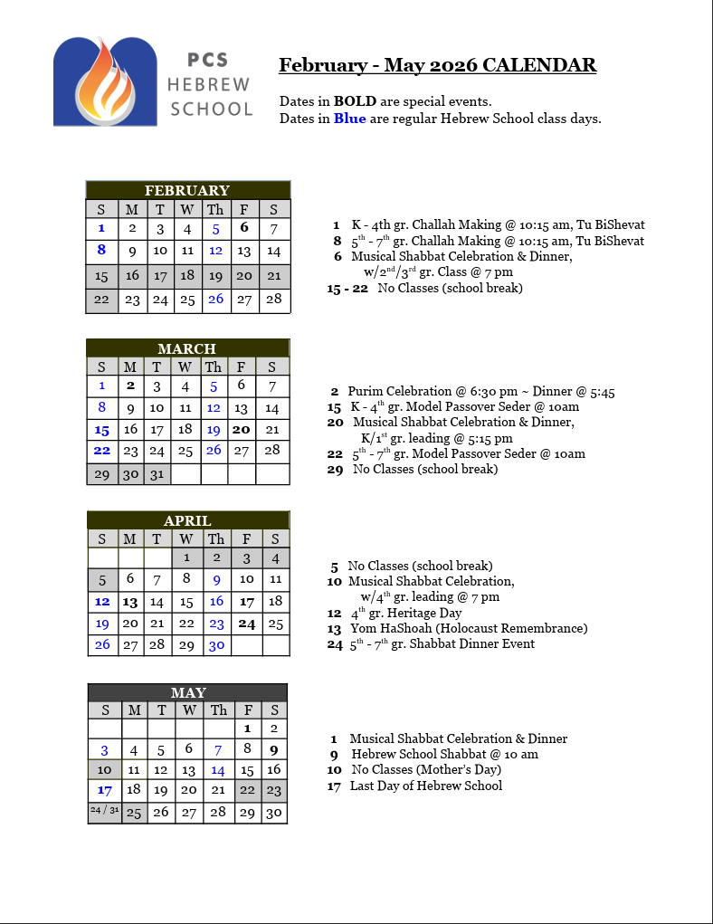 Hebrew School Calendar